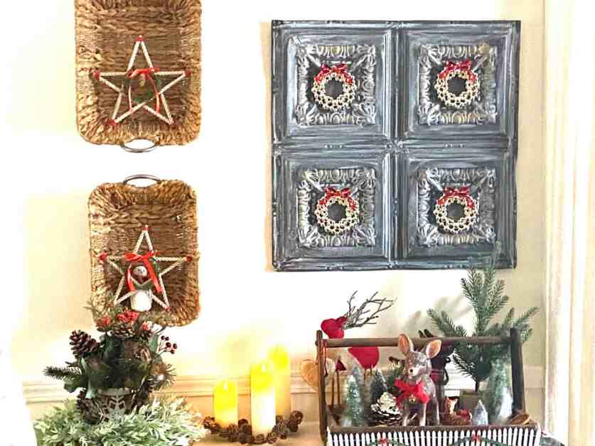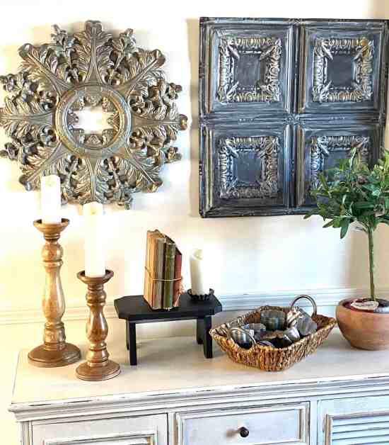 Again, with the old tin pieces, huh? This tin piece has been painted a number of times. Last year I brushed some metallic gold paint on the elaborate parts. And the medallion piece next to it is a lightweight piece from Hobby Lobby, also from many years ago. I couldn’t begin to tell you how many layers of paint are on it. But I do think I need to add something just above the basket to the left of the small tree. Maybe a small picture?