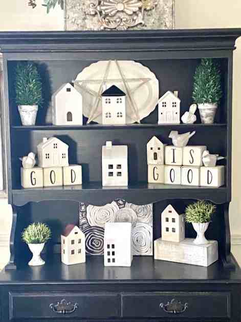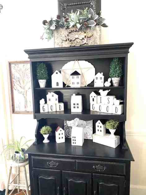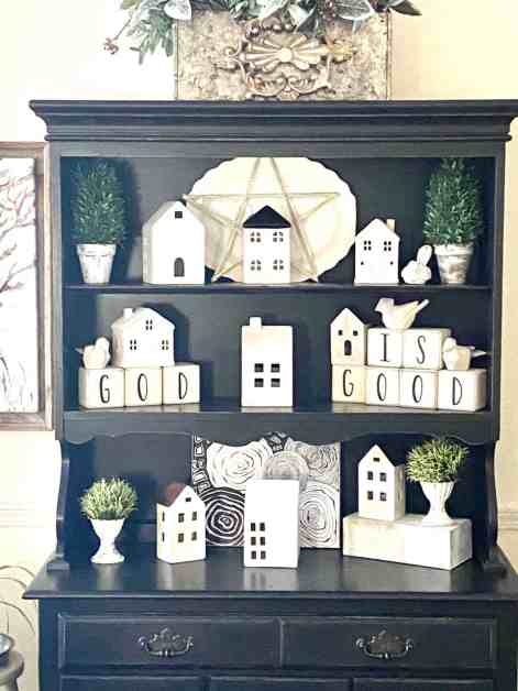 PS. Hey, I added some greenery to the tin piece on the hutch before I scheduled it. This is so much better. Right? In the spring, I’ll take out the greenery with the pinecones on them and then add more of the other.