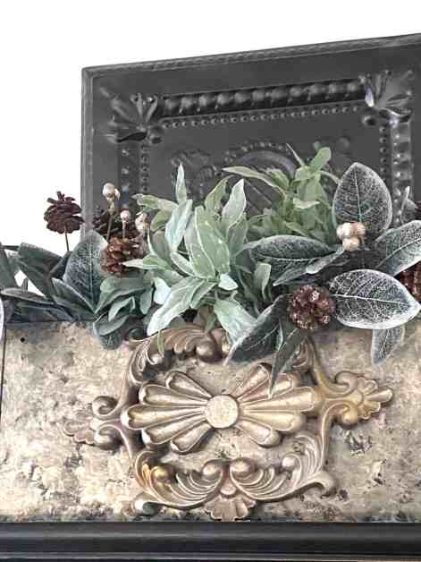 The black piece behind it is a metal ceiling tile. I’ve had this for years, too, as well as three others. They’ve been painted many different colors over the years and are my go-to pieces.
