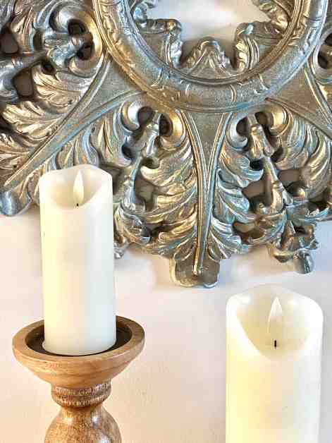 Decorative wood pieces like this medallion are pieces I always buy wherever I see them. It was a muted gold, so I didn’t do anything to it except hot-glued it on the front. I need to add more greenery but am waiting for them to go on sale.