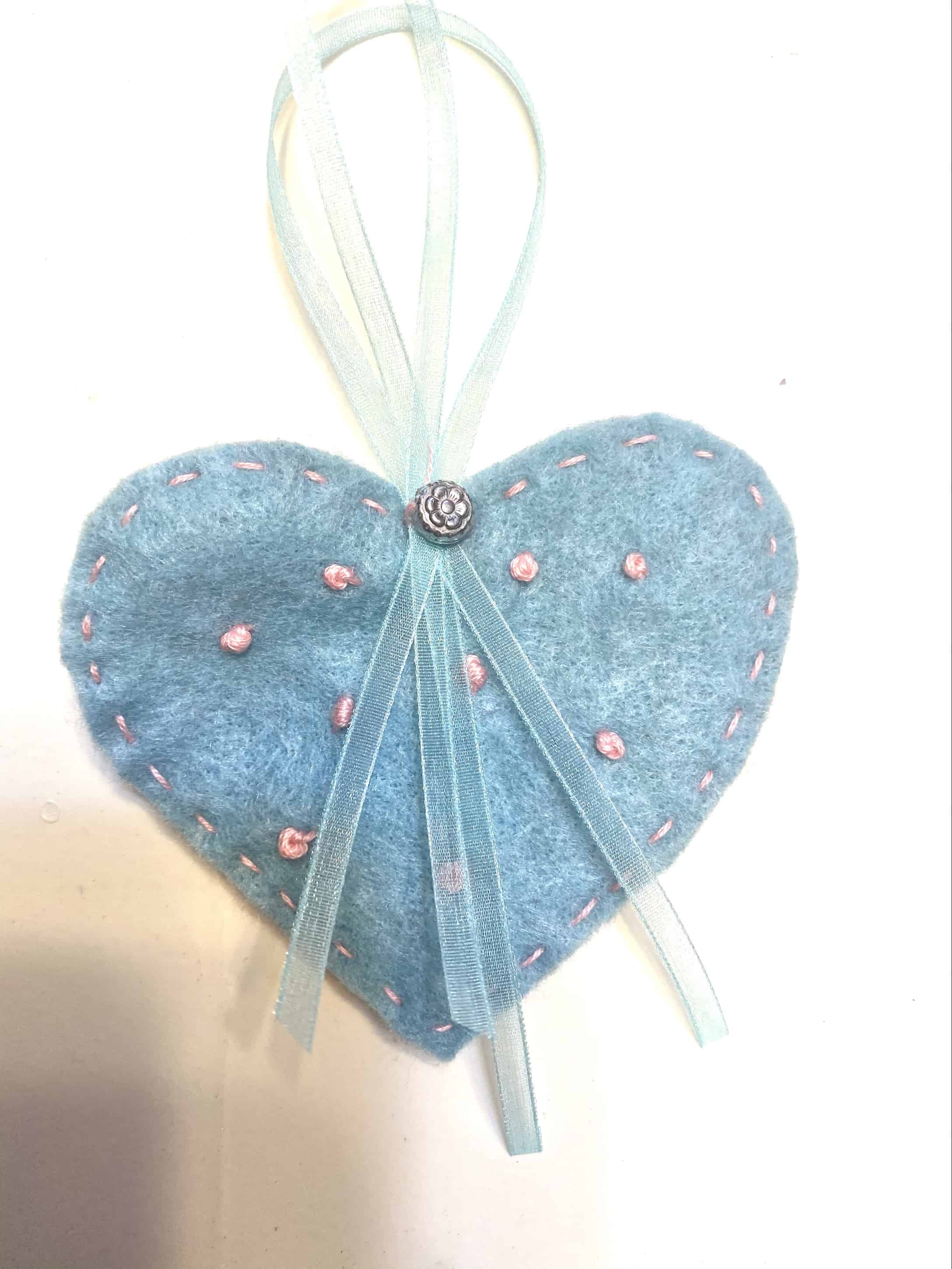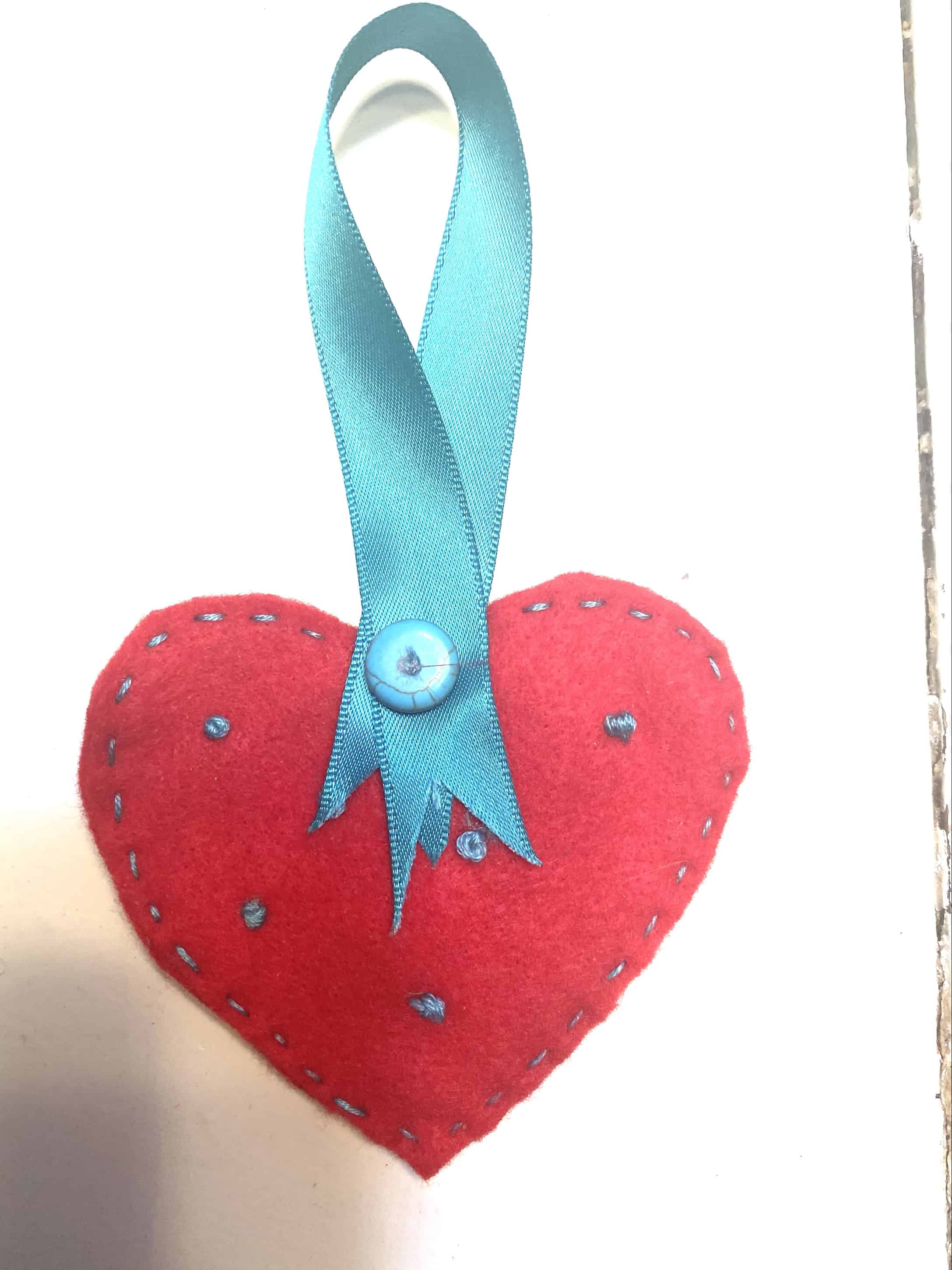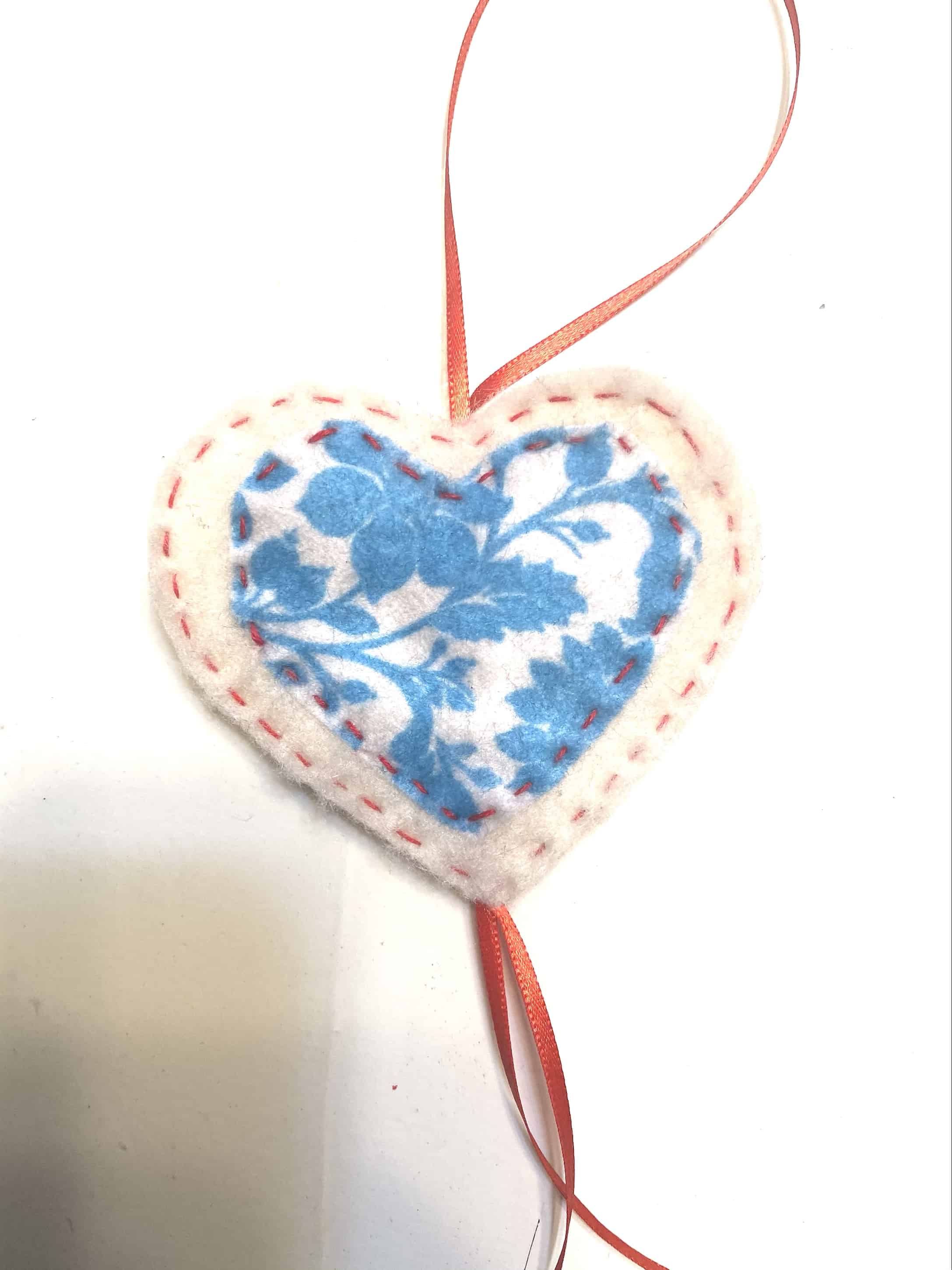 The final ten hearts are made from scrapbook paper and also stitched by hand. They are also stuffed a little with poly-fill. If you look closely, you will see I let some of the polyfill peek out.