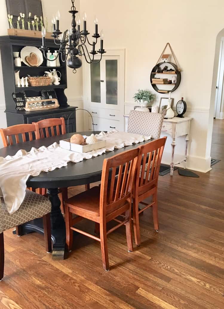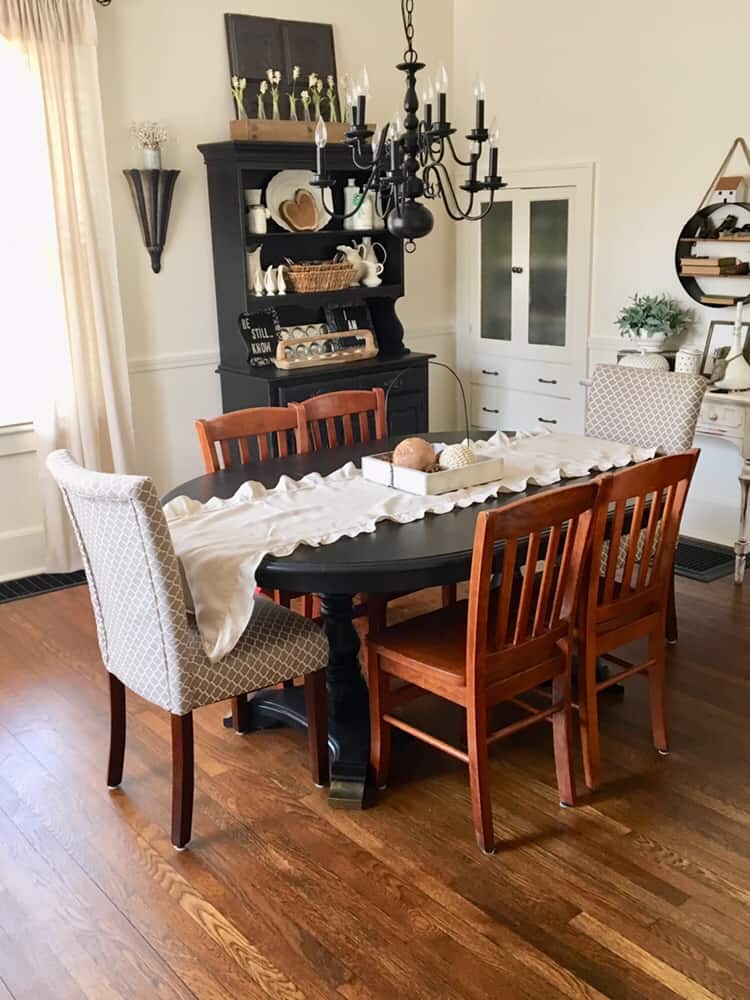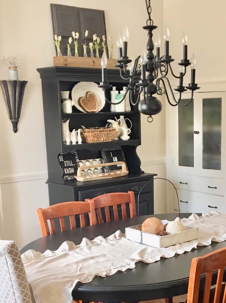 This is my dining room as of now. I love the combination of wood tones with black and white. I painted the table and hutch nine years ago and have never been sorry. The two chairs at each end are from Wayfair. I was really nervous about ordering them but I’m glad I just bit the bullet.