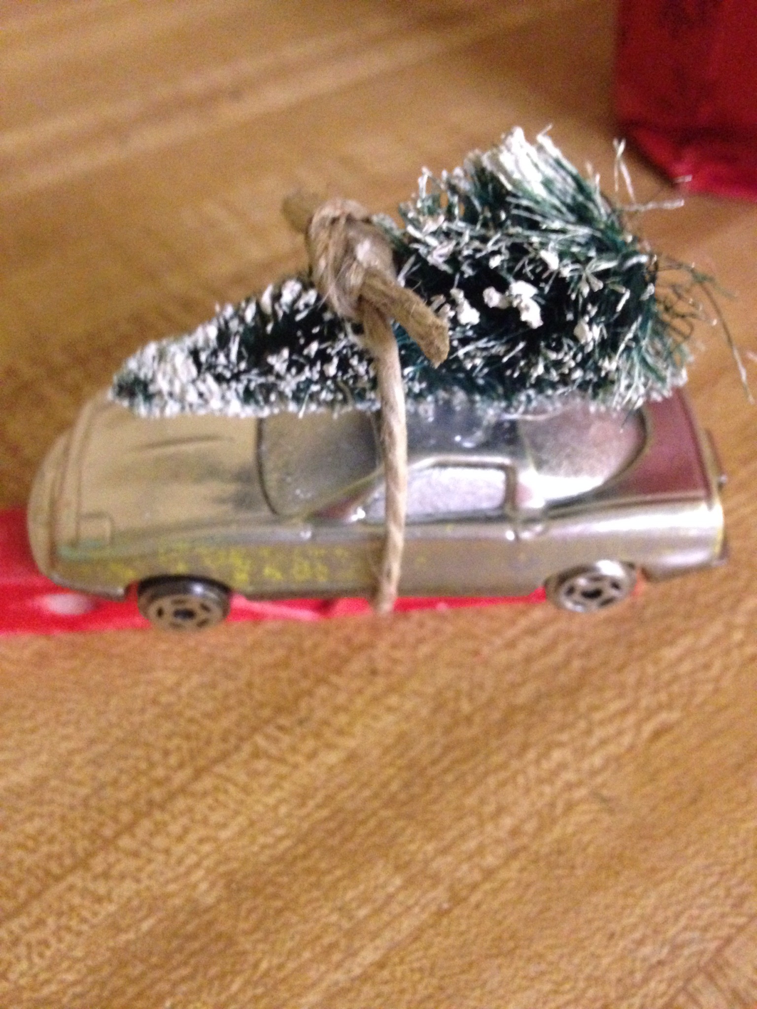 spray painted carsThen I hot glued the little trees (they were in a multi-pack of trees purchased at Jo Ann’s) onto the clothespin and tied it off with the jute. That’s it. These were a present for my daughter and her family. I got the idea on Pinterest but in that version the holders were meant for place cards. Seeing as no one I know does that, I used them for napkins holders. Of course, if you are having a fancy party, you could use them for for heir original intended purpose.