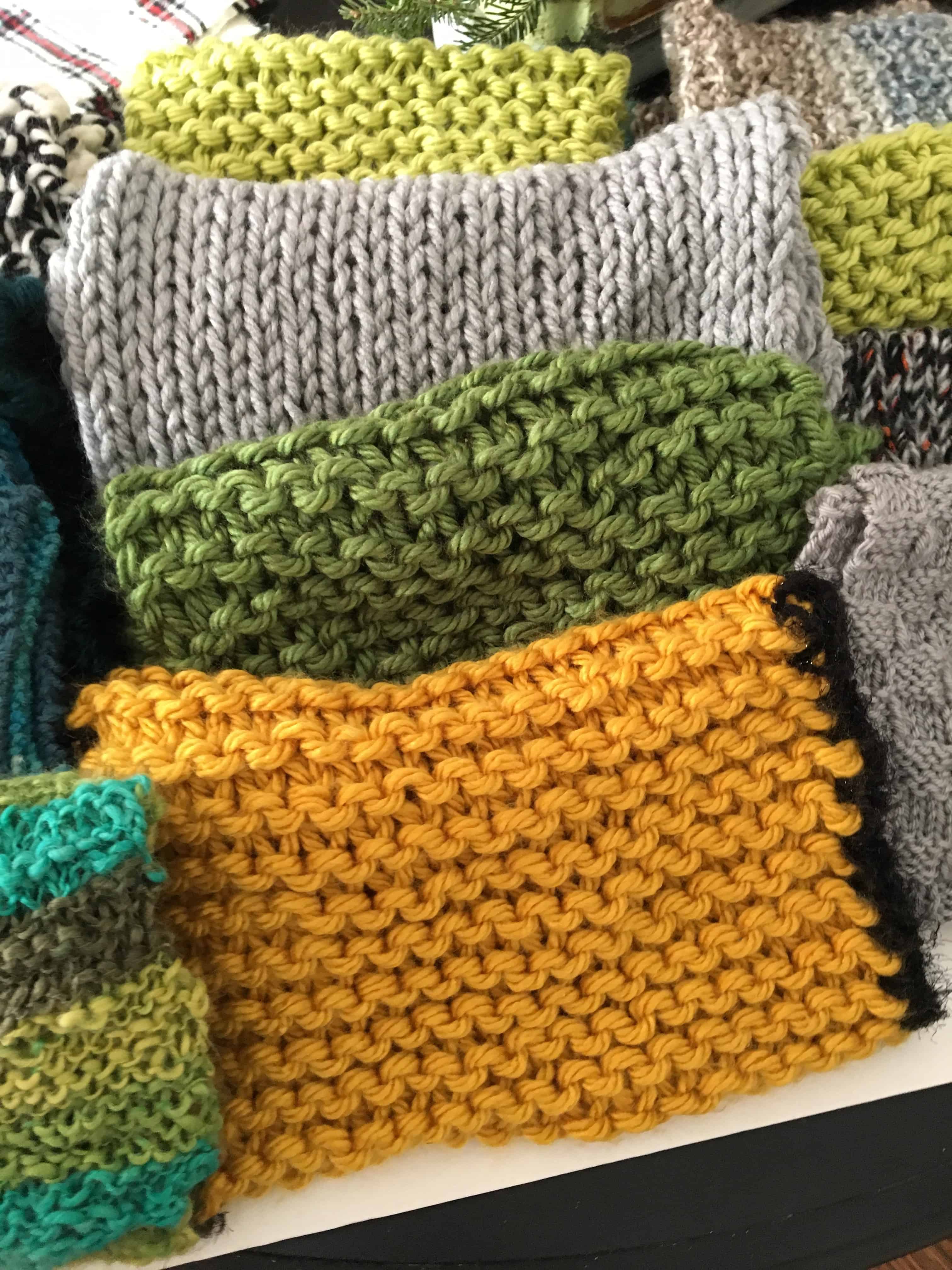 And now the scarves. Most of these were cowl-type infinity scarves but they were all different sizes. Some you can wrap around the neck two or three times, others only once. Some were bulky-type yarns, other’s much thinner. It was fun to see how they all turned out and I learned al lot about needle and yarn size and how they determine the final product.