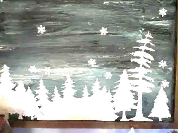 The picture below is the winter sky. I painted the back of an old picture and then cut out the trees from watercolor paper and glued them on. Some of them overlap. The snowflakes are stick-ons from the Dollar Tree.