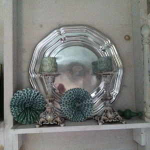 What a great find. Would you believe I paid five bucks for this brand new rope pouf? Found the tray at same time. Looks great in LaCabinette. I never fail to find something great there. It’s in Cadillac, Mi. Live thrift shopping. Oh, the silver platters are from there as well. I got them at same time. They’re those disposable plastic trays you buy for big gatherings. They look like the real thing. You gotta’ love Goodwill!
