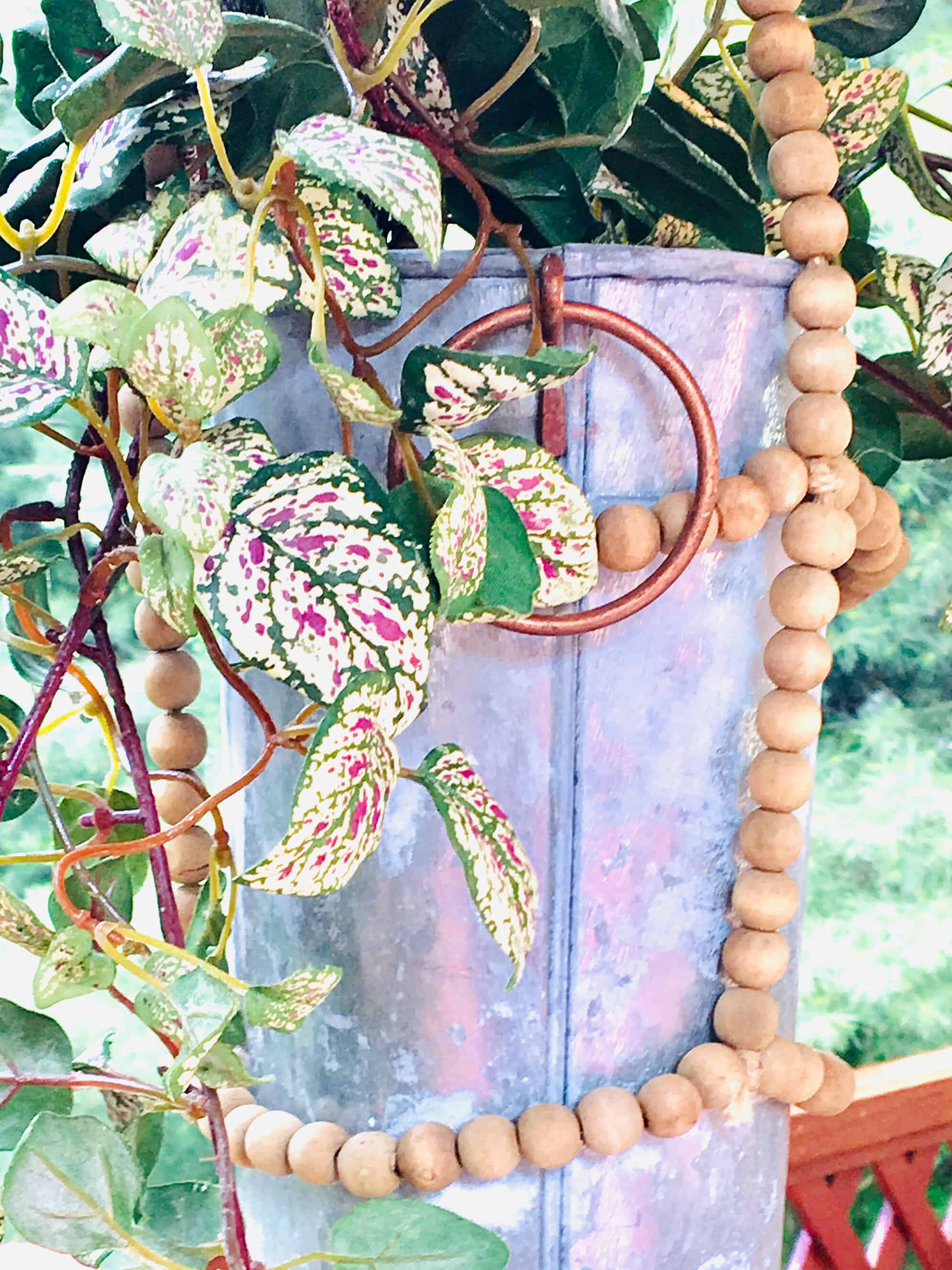This is a beaded holder that is supposed to be used for a different shape but I made it work with this fifty cent mental bucket and a dollar’s worth of garage sale greenery.