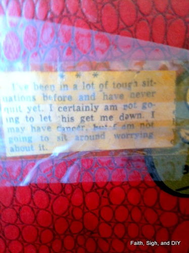 I think about this woman often. I figure it was a woman because it’s a sewing case. Why did she tape the message to the box lid? Did she put the message there because she sewed a lot and wanted to read those words of encouragement every time she opened the box? Did she take her sewing box with her for her chemotherapy treatments? Was she making something special? Something to leave behind?