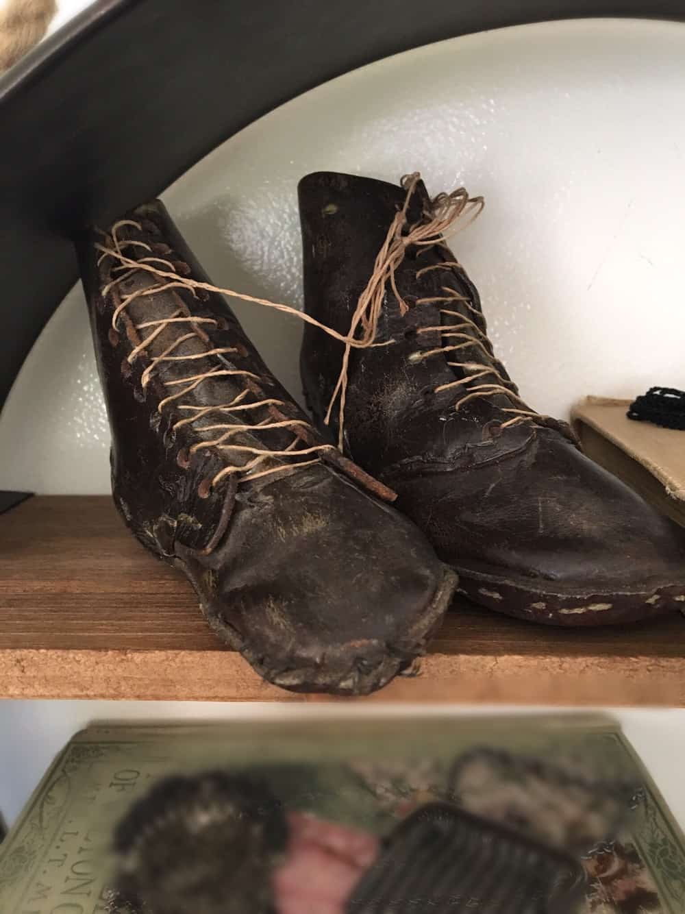 The single old shoe you see on the second shelf is from a woman I got to know through a volunteer agency. She was about eighty-five at the time and I was about thirty. We became fast friends so I quit the volunteer agency because it didn’t seem right to be reimbursed for gas mileage anymore. We remained friends up until her death. I have never forgotten her and this little shoe always reminds me of her. It was her son’s baby shoe. She had no idea where the other one was. 🙂