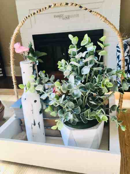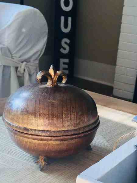This is an old wooden berry holder. I wrapped the wire handle in jute.