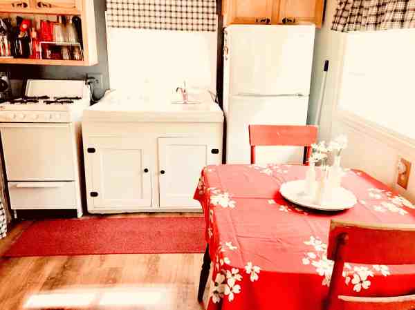 My sweet husband added pallet boards to my “counter” below. I absolutely love it. The tablecloth is vintage and I have collected lots of them over the years.