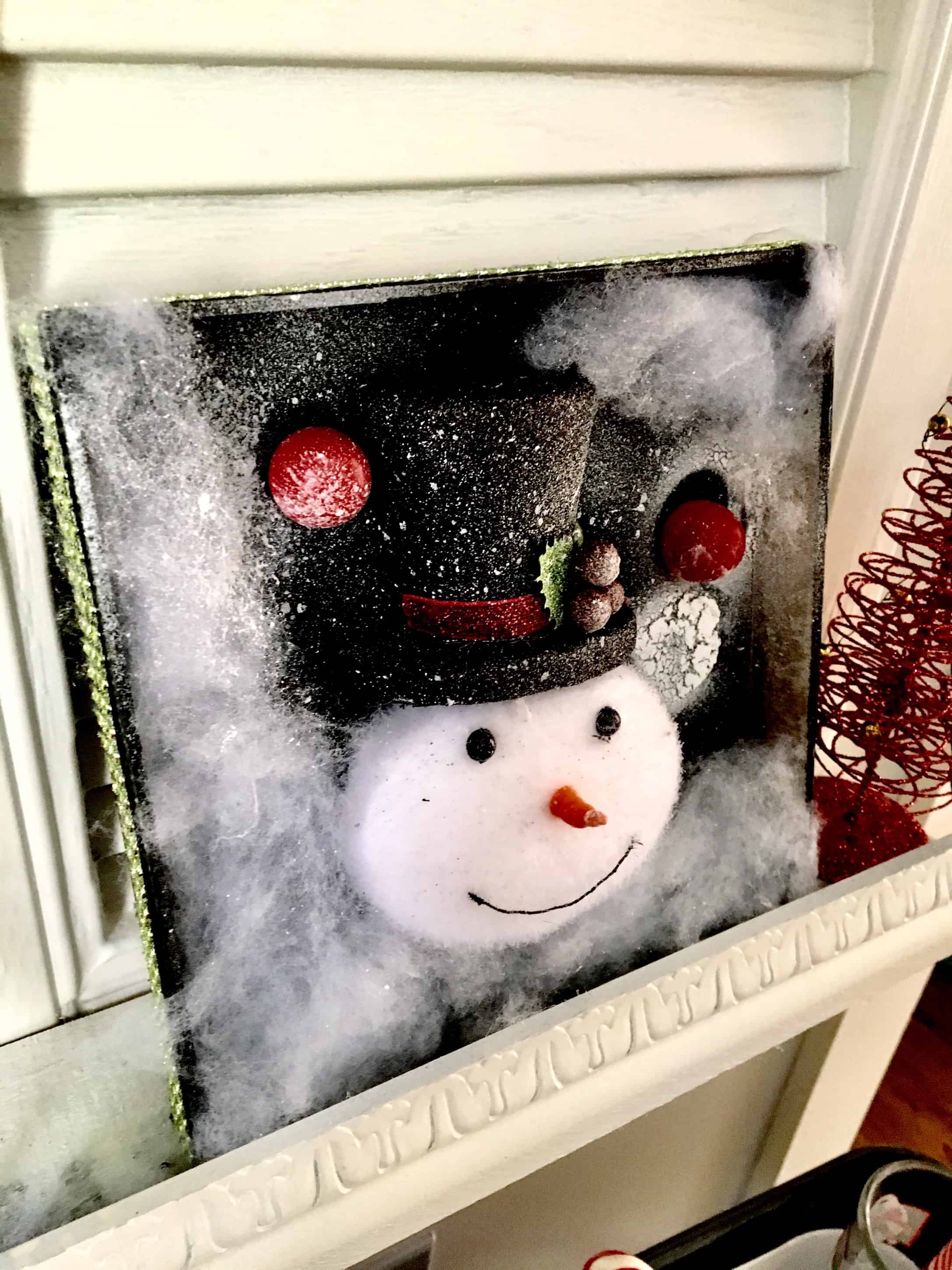 They are both little pictures/signs that Dollar Tree stocks for every season. For this first one, I panted the frame black and then glued scrapbook paper to the front, and used some Washi tape on the edges. I painted it even though I knew I was going to cover it just to make sure nothing underneath showed. I hot glued the snowman head (Dollar Tree as well.) and then prayed some artificial snow.