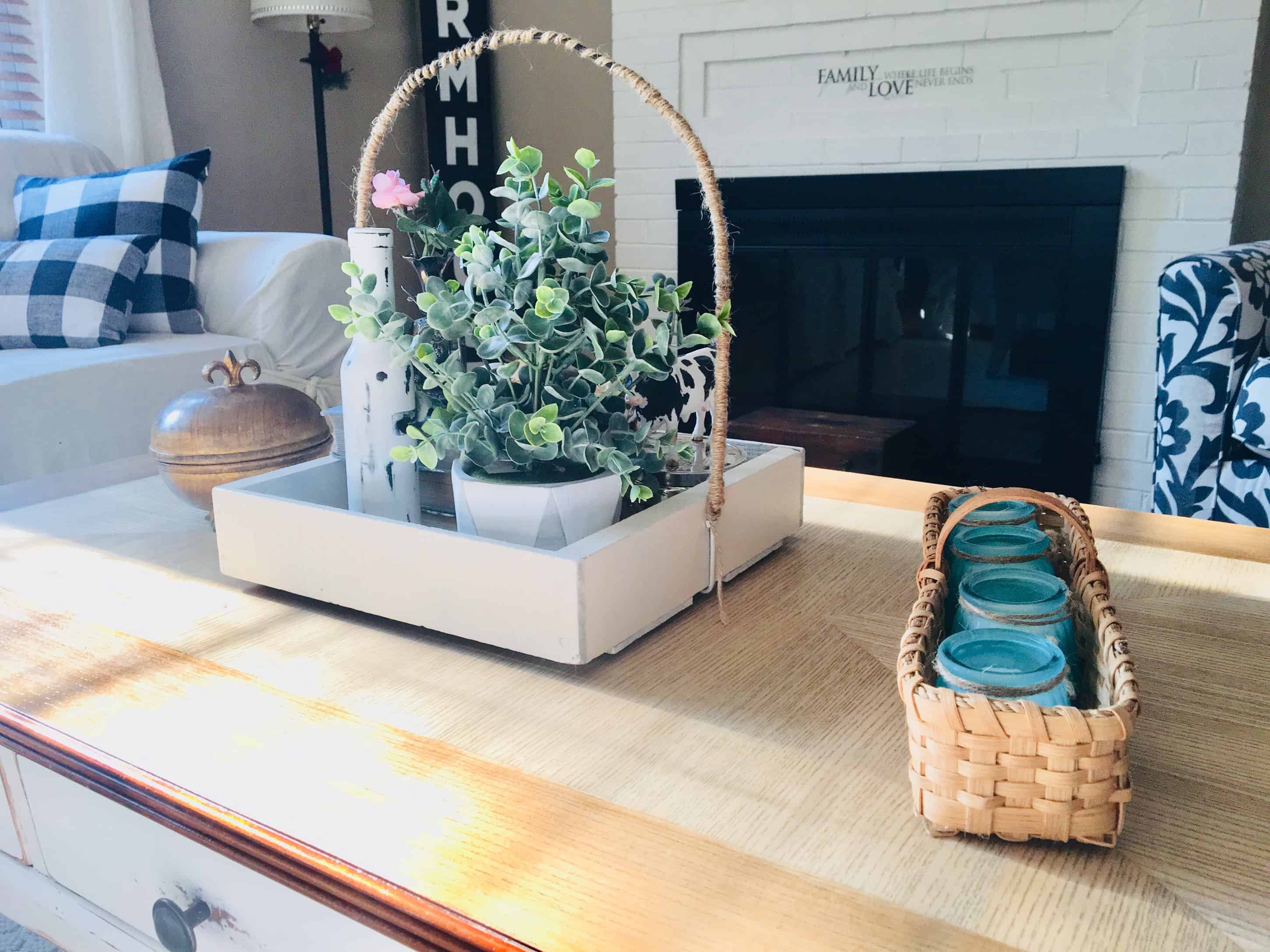 This is an old wooden berry holder. I wrapped the wire handle in jute.