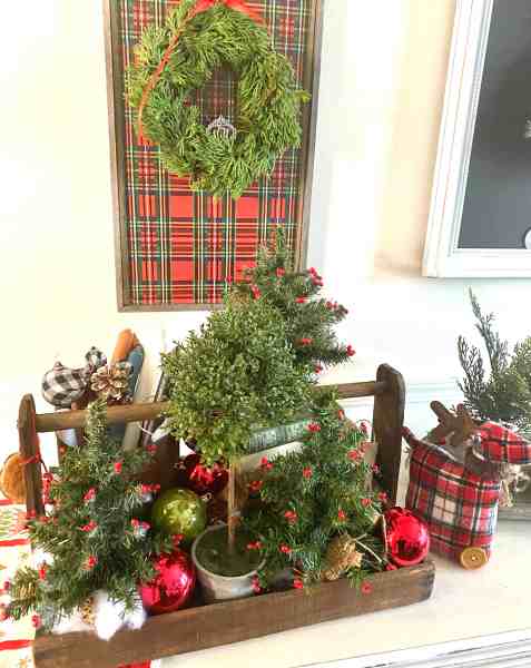 As I said, I only used about a third of my decorations this year because of the puppy so I just added Christmas picks and balls and tucked them into the existing pieces. Not my favorite but OK for this year.