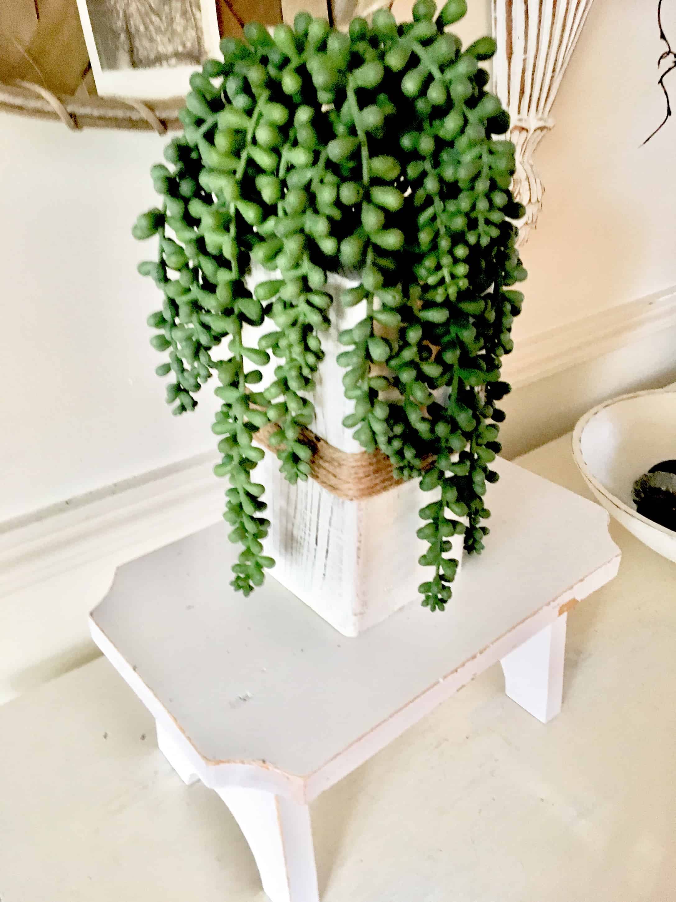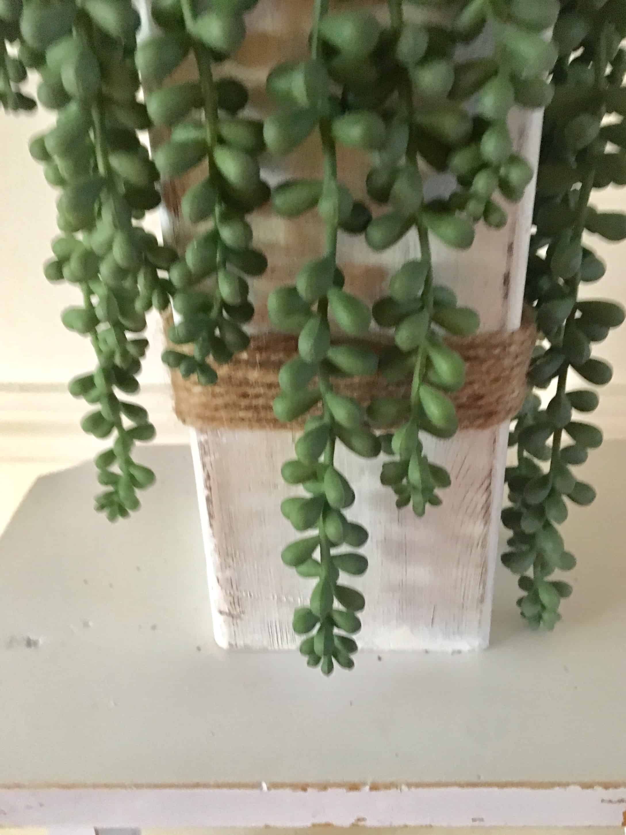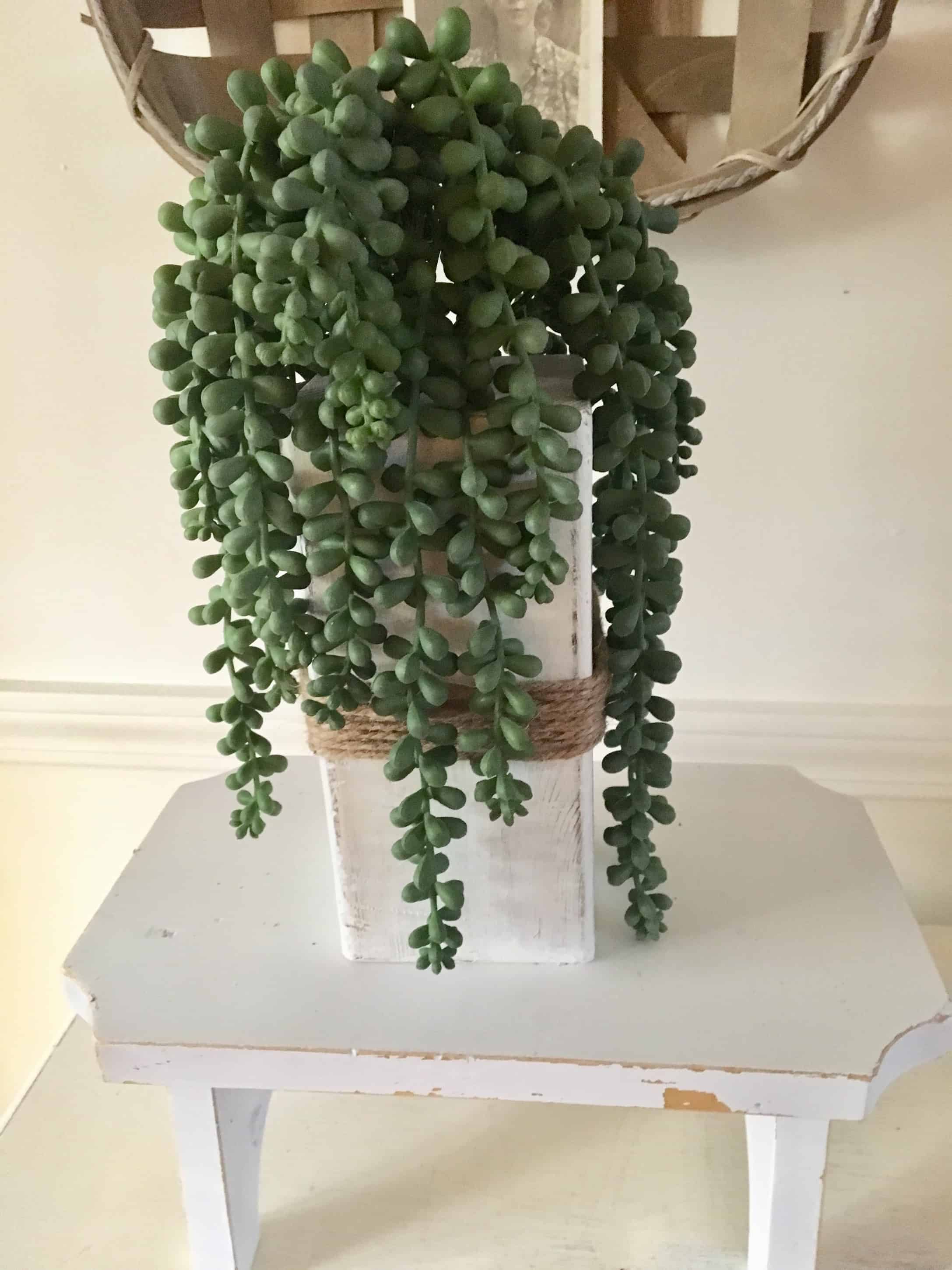 I wrapped some jute around the block and plopped in the succulents. I love how they hang down. I’m sure I’ll use them numerous ways as we move from season to season. Although, certainly we missed spring. Right?