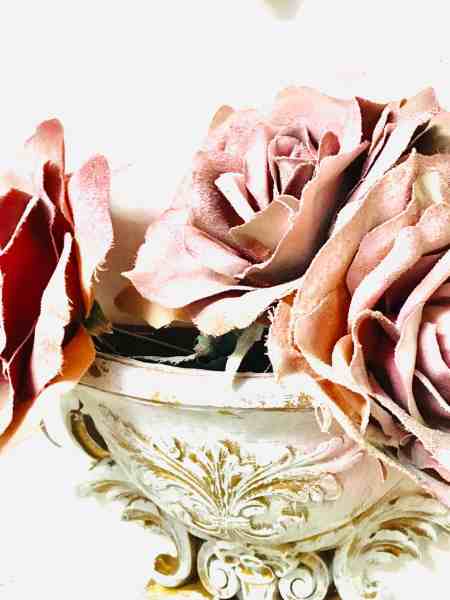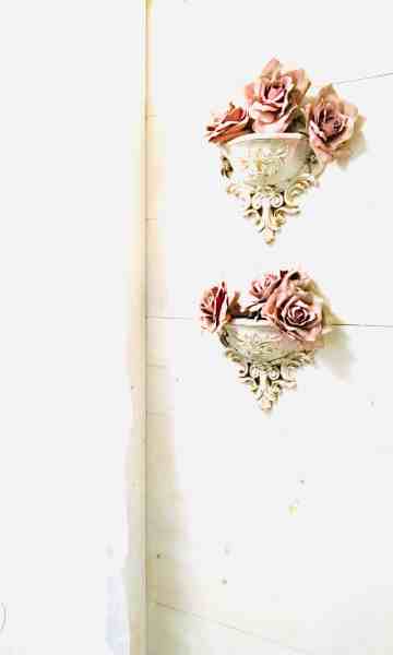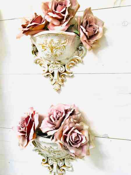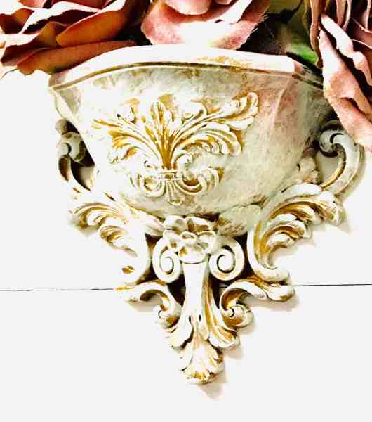 I had some left over so I gave them the same paint treatment and placed them in these sconces that I dry brushed white over gold. I collect the lightweight sconces and use them over and over again in different ways. I don’t like the heavy ones.
