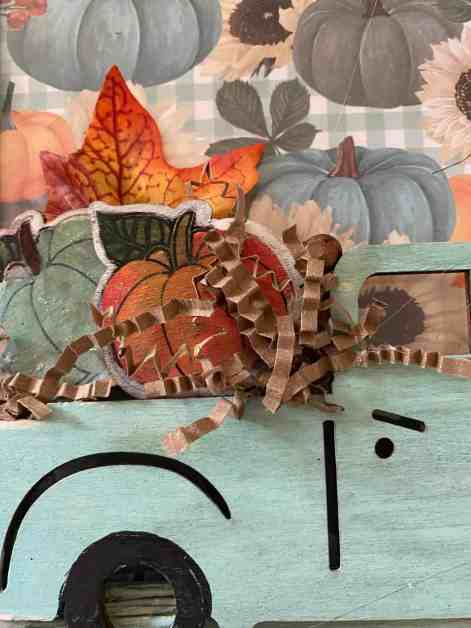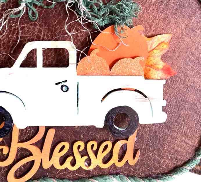 The leather “blessed” was taken off and redone so no glue showed up but I didn’t take a picture of the cleaned-up one. Needless to say, it was much better. The blue car pumpkin background is some “pleather” I had laying around.