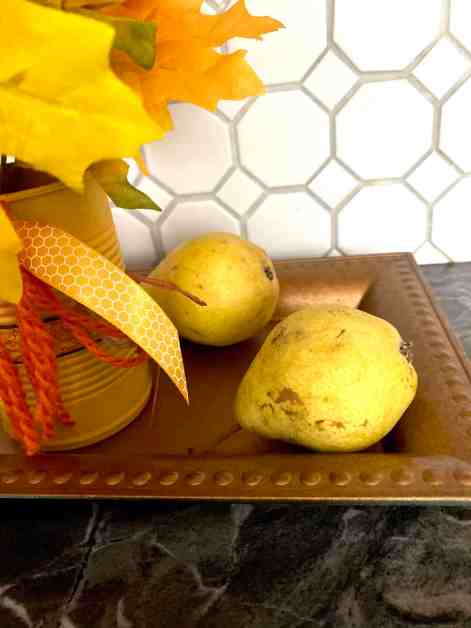 This little arrangement might be my favorite. I spray painted a soup can, add DT leaf foliage on a DT tray. We had just bought some pears, so it was perfect. My husband as eaten all the pears so now I have to get more because the pears just made it.