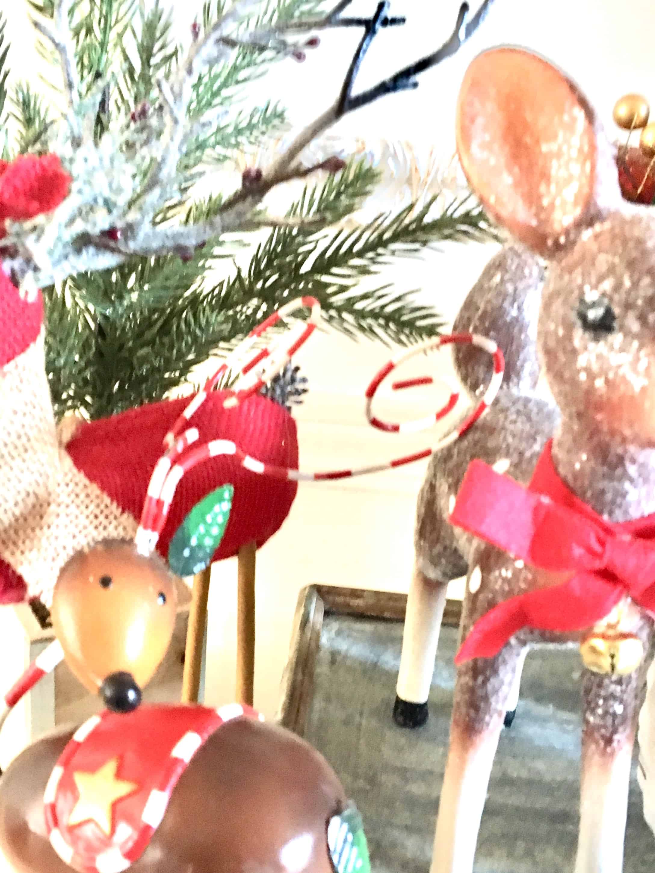 This is my dining room table arrangement. The trees are wrapped in strips of the same blanket as the wreath mentioned earlier. You will see it in total tomorrow along with my hutch.