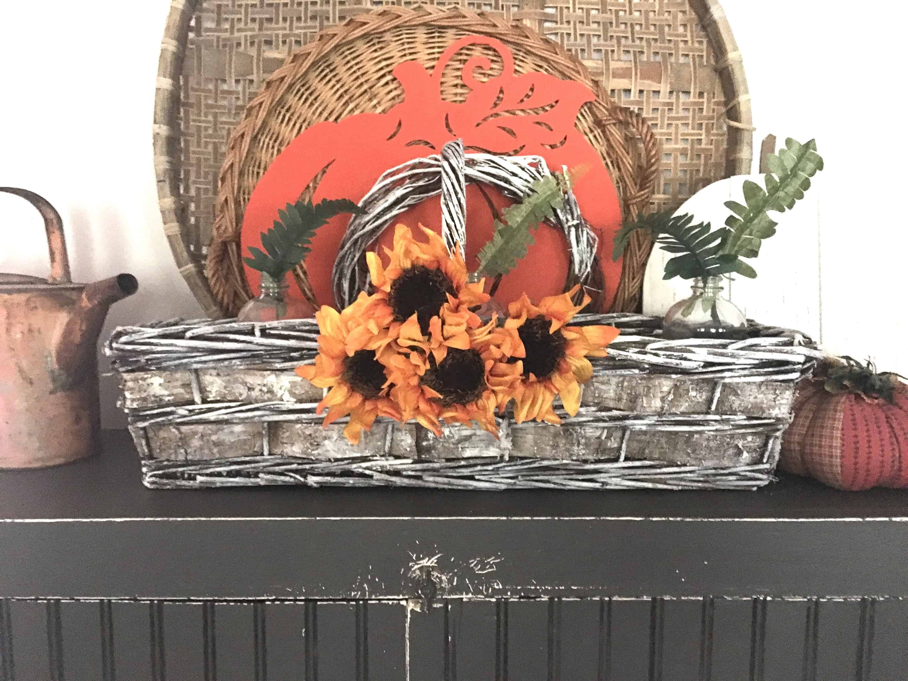 Don’t you love the orange plates and the black and white chargers? The napkin holders are from a package of felt sunflowers that I glued on napkin holders.