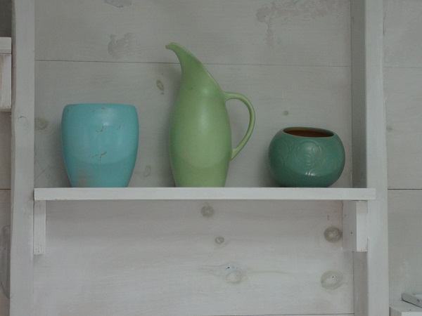 My friend wants to keep the cost of these projects down to a minimum. So far we’ve mostly just purchased paint. Tonight, for example, we “shopped” in her basement and found the perfect piece for her bedroom dresser. The color scheme is sea-foam blue, jade, and then a yellow- tinged green. The walls are the sea-foam color, soft and pretty. Colors are very similar to vases in this picture which sit on the wall in our La Cabinette.