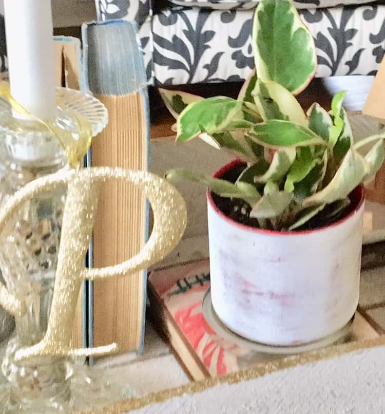 The container with the plant on top is a cleaned out candle holder from a Bath and Body Works candle. I painted it red. Then painted it white and distressed it.