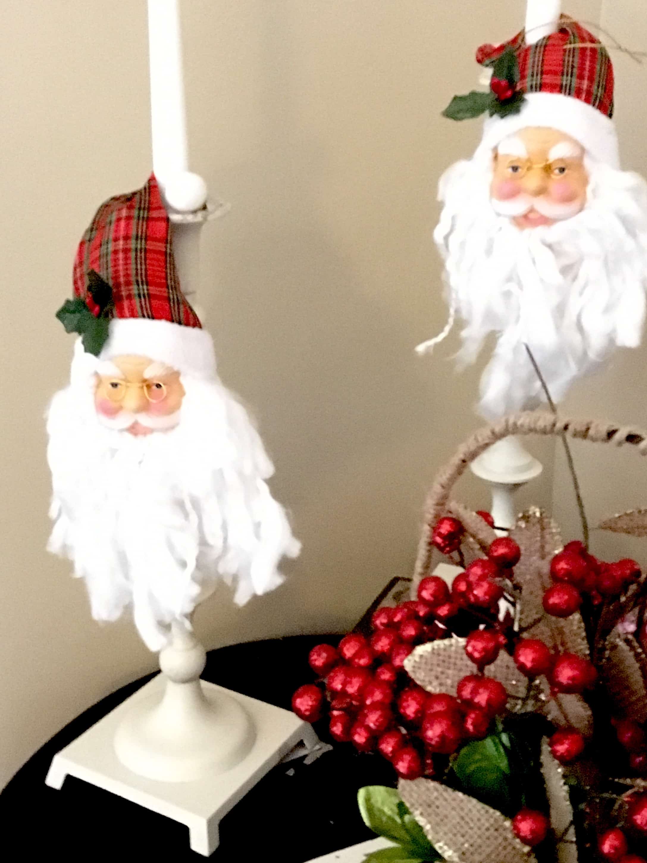 I love the cheap Santa heads you can get at the Dollar Tree. I’ve used them countless ways. Here’s how I used some of them this year.