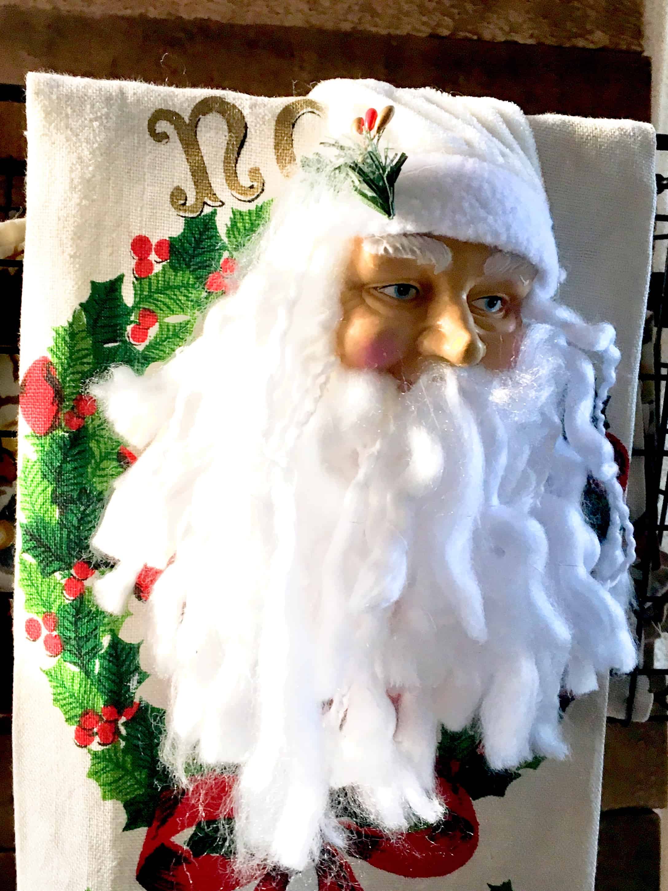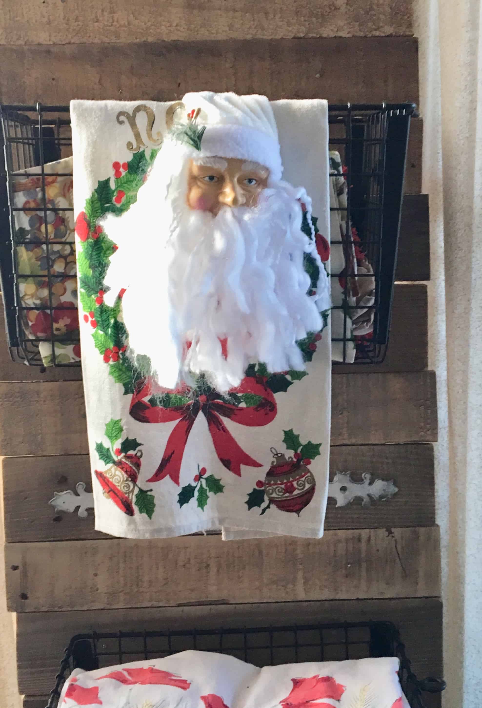 This is a “pallet-board-with-wire-baskets-thingee” I made a year ago. You can find that project here. The baskets hold my vintage linen. I also have vintage Christmas linen which I hung on the outside of the baskets and then draped the Santa heads over for an added touch of whimsey.