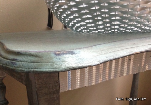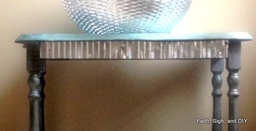 I sanded lightly.The blue is Aqua spray paint by Rustoleum which I stained over after it was dry. I had some metal flashing that I cut and attached with little brads on the under ledge. The legs were painted Metallic Silver, also by Rustoleum. The basket was silver. Wasn’t that lucky?