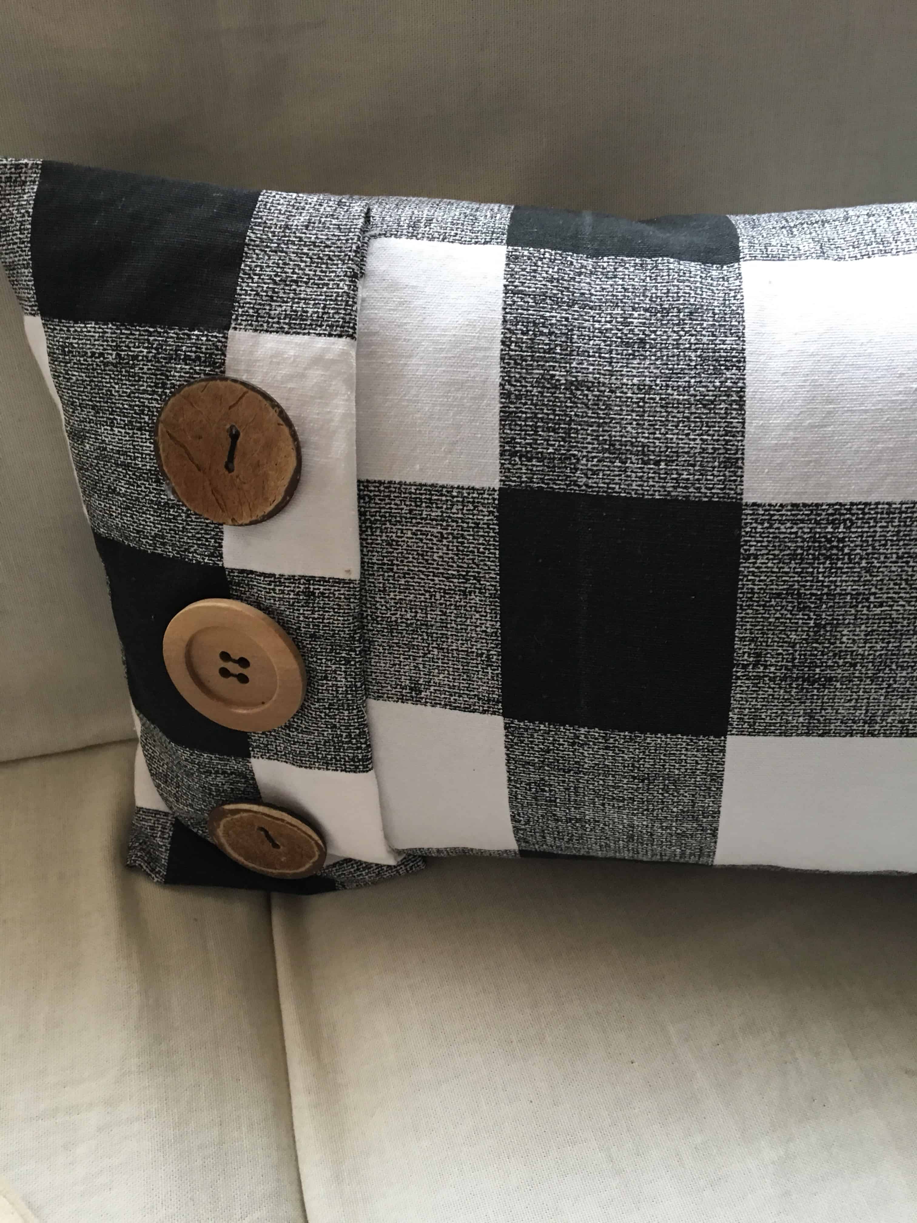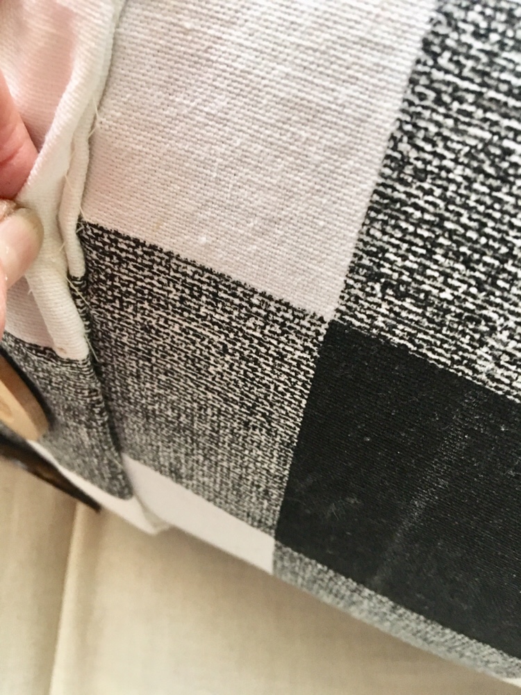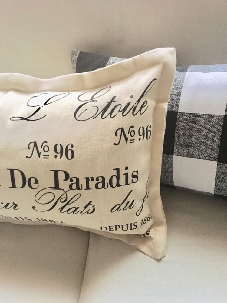 I also made the black and white checked ones in the background. For those, I ordered the fabric online for $8.00 a yard and sewed two pillows out of it. This pillow creation ended up this way simply because I had a lot of material left over. I wasn’t sure exactly how long I was going to make it. Then I realized I already had the perfect pillow in my stash but it was quite a bit shorter. I almost cut off the excess but then I thought of this. I mean, really. Isn’t it cute?