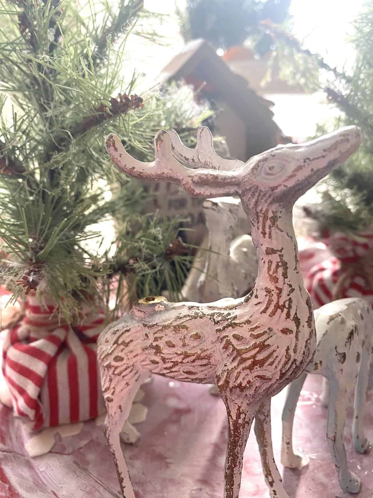 This next little vignette is a white tray I gessoed and then wiped off. The metal deer are from an estate sale, the trees probably from Hobby Lobby last year, as well as the little sign.