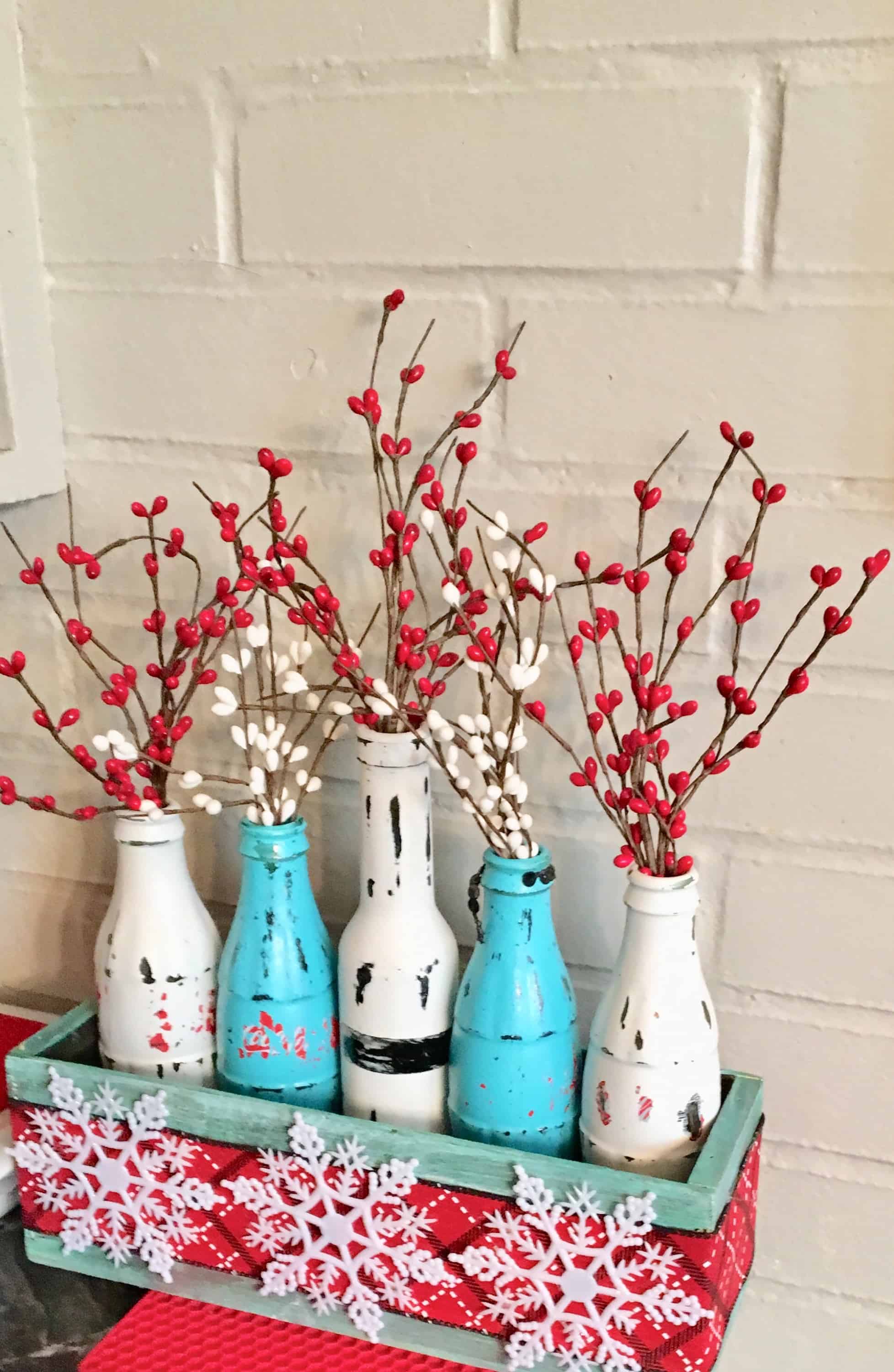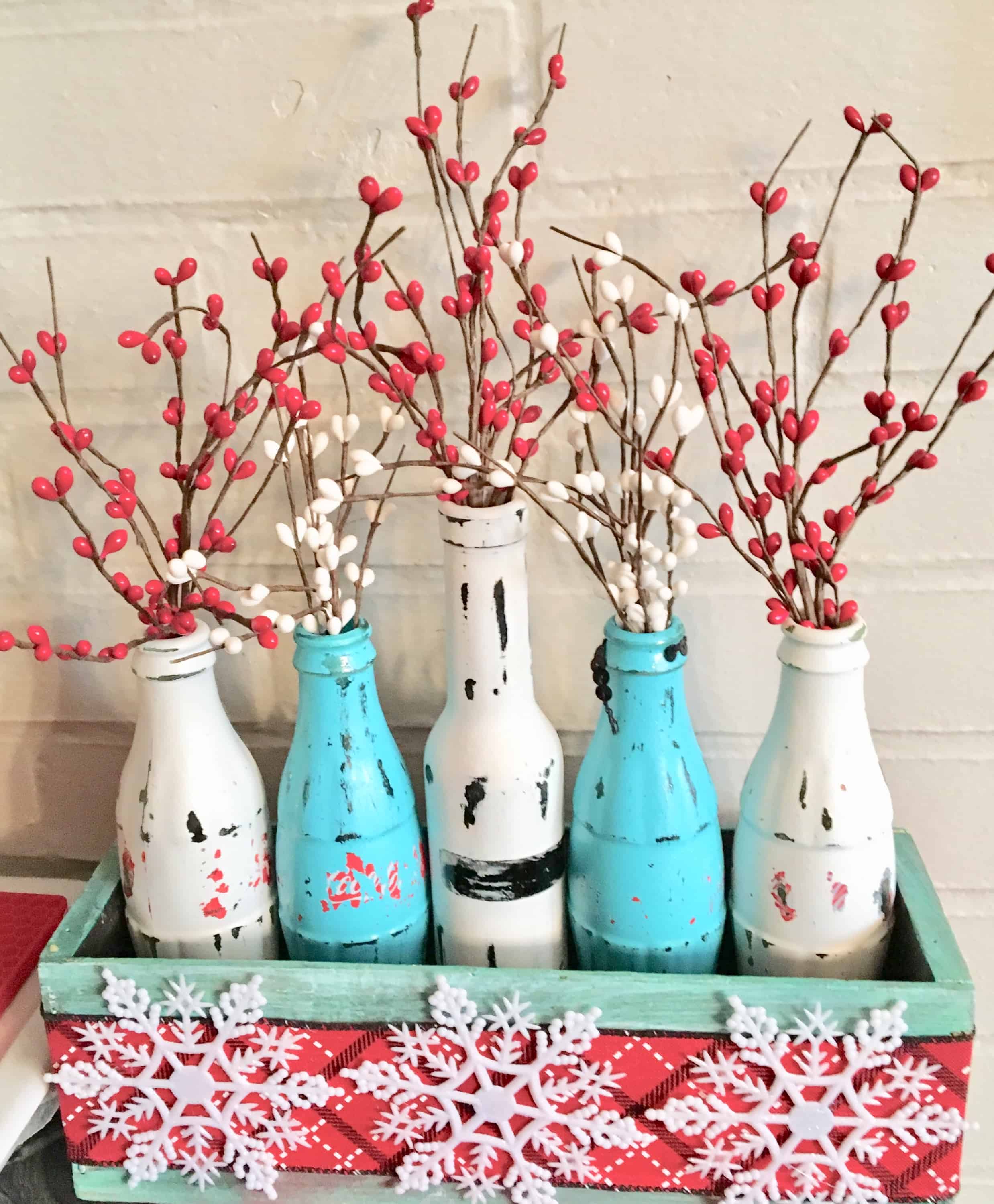 This year I wanted to use one of my favorite color combos for Christmas ideas in the kitchen, red and aqua. I had these mostly Coke bottles (one in middle is a vinaigrette I had already painted and distressed that I had used before. I had stored them away for future reference just because I like them so much.