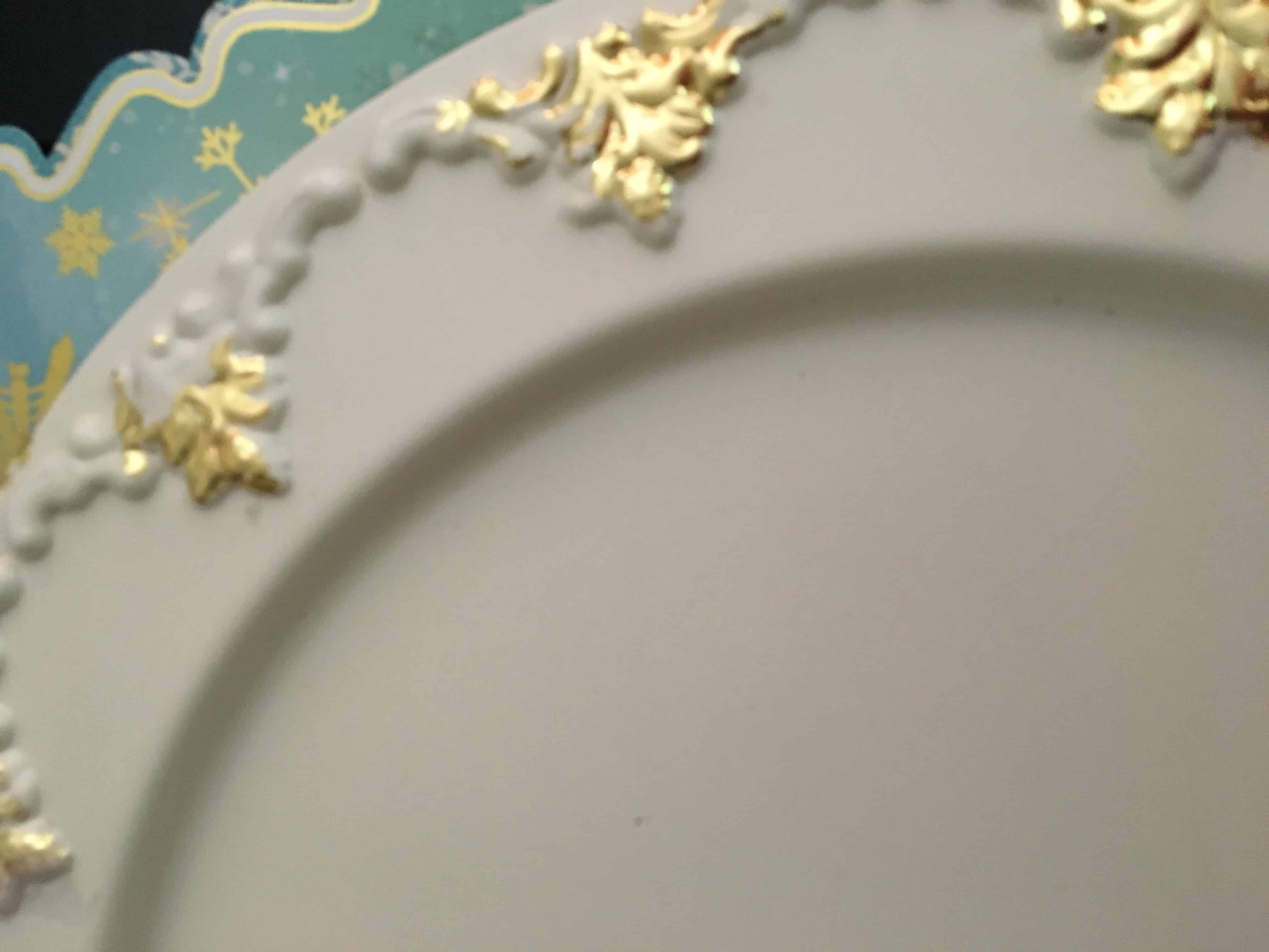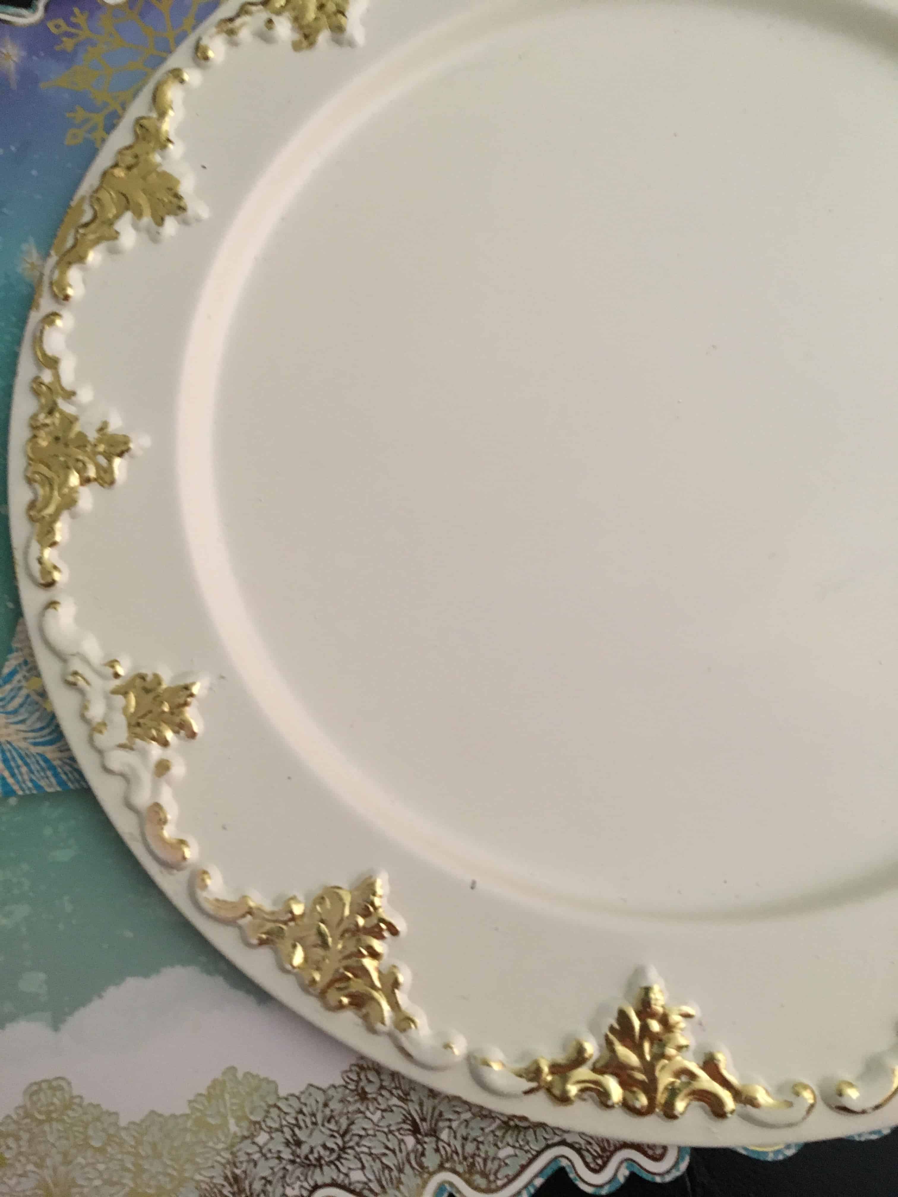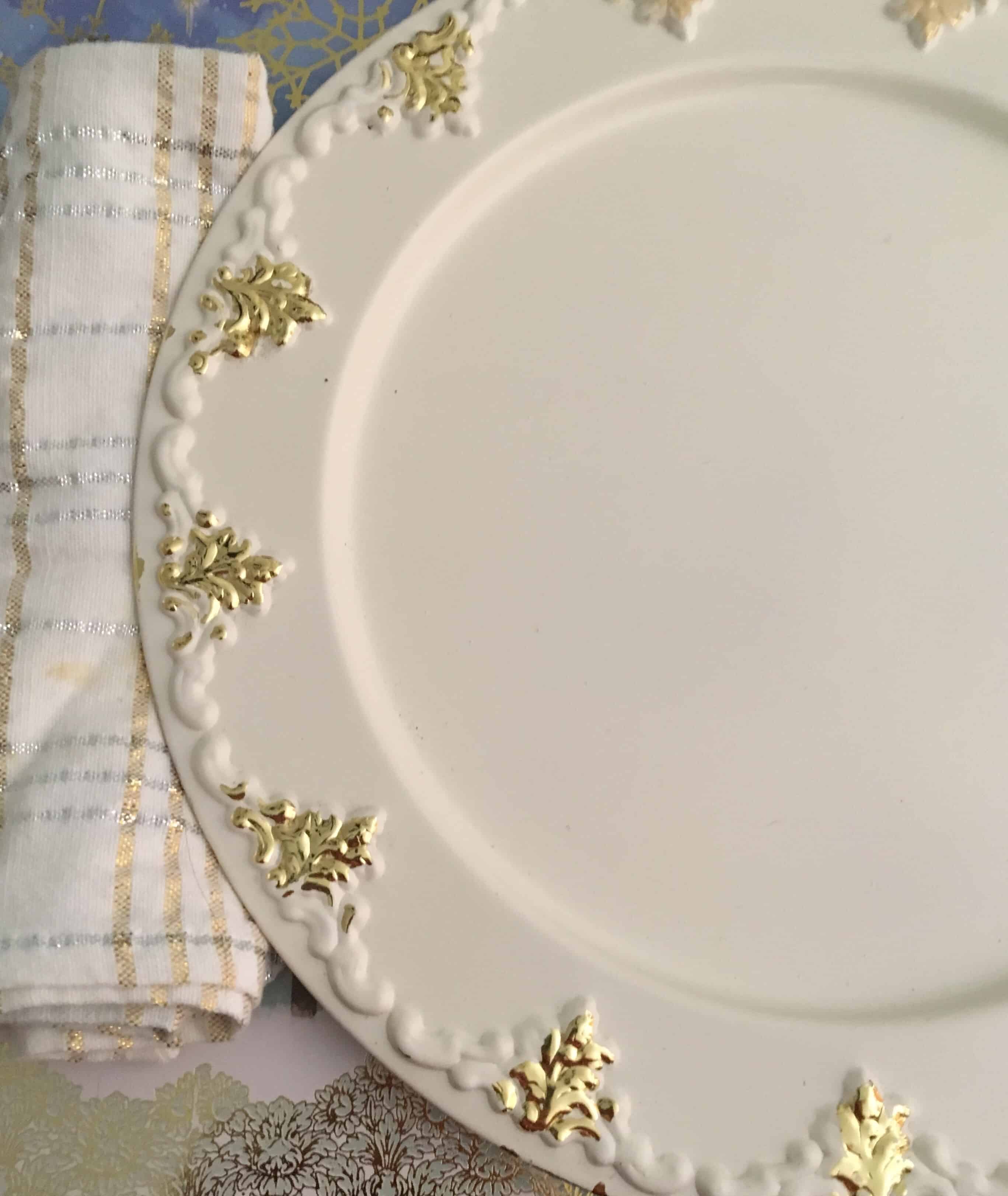 These are some paper placemats I bought in Chicago a number of years ago. I love them but I’ve never used them because none of the dishes I put with them looked right. Painting these chargers white and letting some gold “peek” through, were the perfect addition.