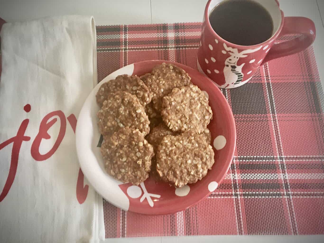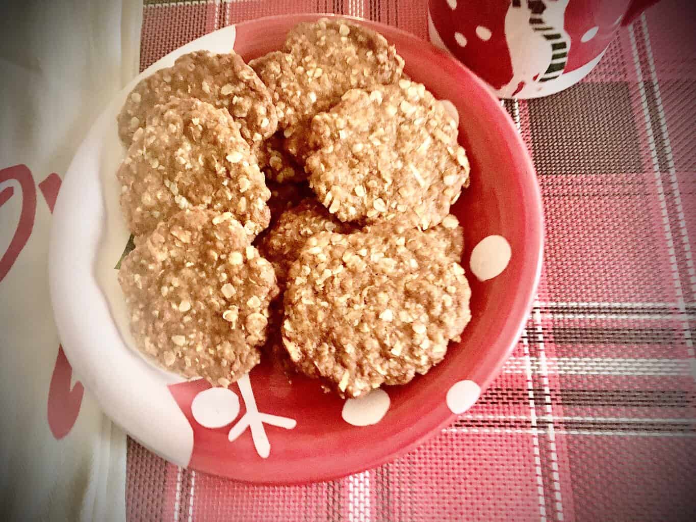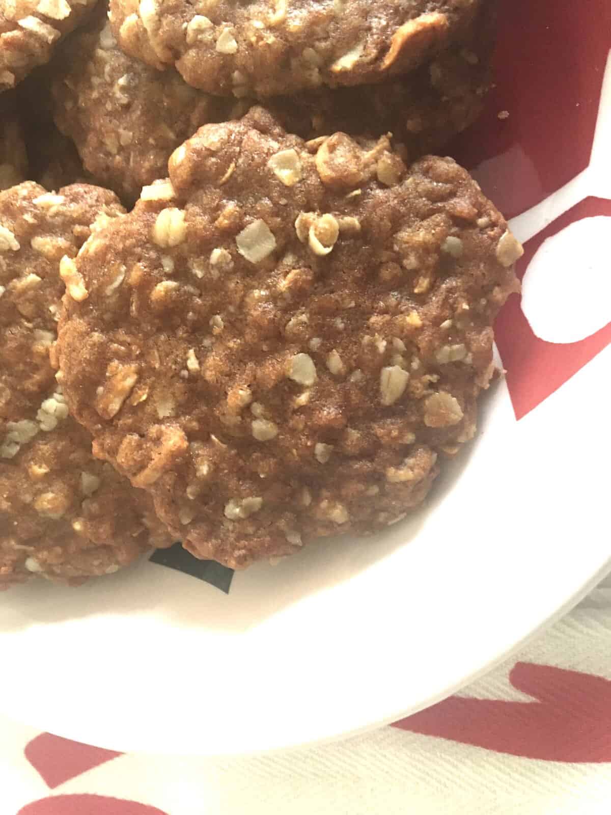 ANZAC stands for “Australian, New Zeeland Air Corp”. These cookies were developed as a high calorie, long-lasting cookie for the enlisted men. They ship easily and because there are no eggs, they were able to keep them for a long time.